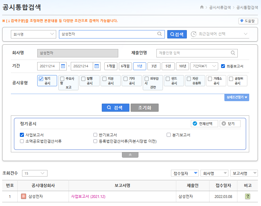 전자공시시스템(DART)에 접속하여 검색하고자 하는 기업을 선택하면 그 기업의 공시를 전부 볼 수 있습니다. 본 글에선 삼성전자의 사업보고서를 이용하도록 하겠습니다. 아래 사진을 참조하여 직접 검색해보세요. 직접 해보시는 게 중요합니다.