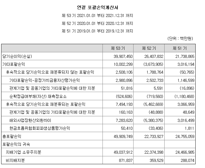 기업이 한 해 동안 얼마를 벌었고, 돈은 얼마 갖고 있는지에 대한 모든 정보가 "재무제표"에 담겨있습니다. 그중 얼마를 벌었는지 나타내 주는 포괄손익계산서를 보겠습니다.