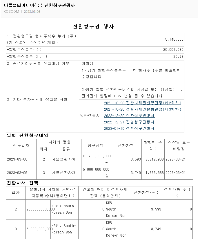 다믈멀티미디어는 2023년 3월 6일 187억 원 규모의 전환청구권 행사로 5,146,656주가 신규 상장한다고 공시했습니다. 이는 발행주식총수 대비 25.73%이며 2회차의 경우 전환가액 3,593원에 3,812,968주, 3회차의 경우 전환가액 3,749원에 1,333,688주를 발행하였습니다. 2회차와 3회차 모두 상장 예정일은 2023년 3월 21일입니다.
