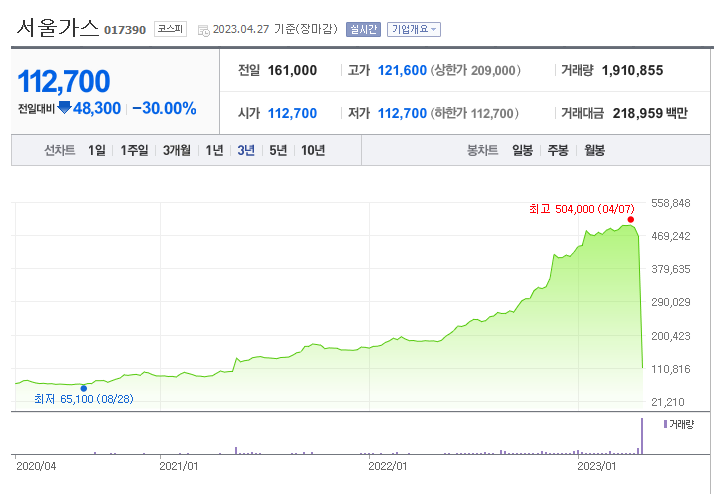 서울가스의 주가는 크게 하락하고 있습니다. SG계좌 작전세력이 픽한 종목으로 다단식 주가조작에 관여된 종목으로 추정되고 있습니다. 현재 계속 하한가를 기록하며 폭락하고 있는데도 PER은 31.87배로 동일업종 평균 PER 3.51배에 비하면 크게 높은 수준입니다.