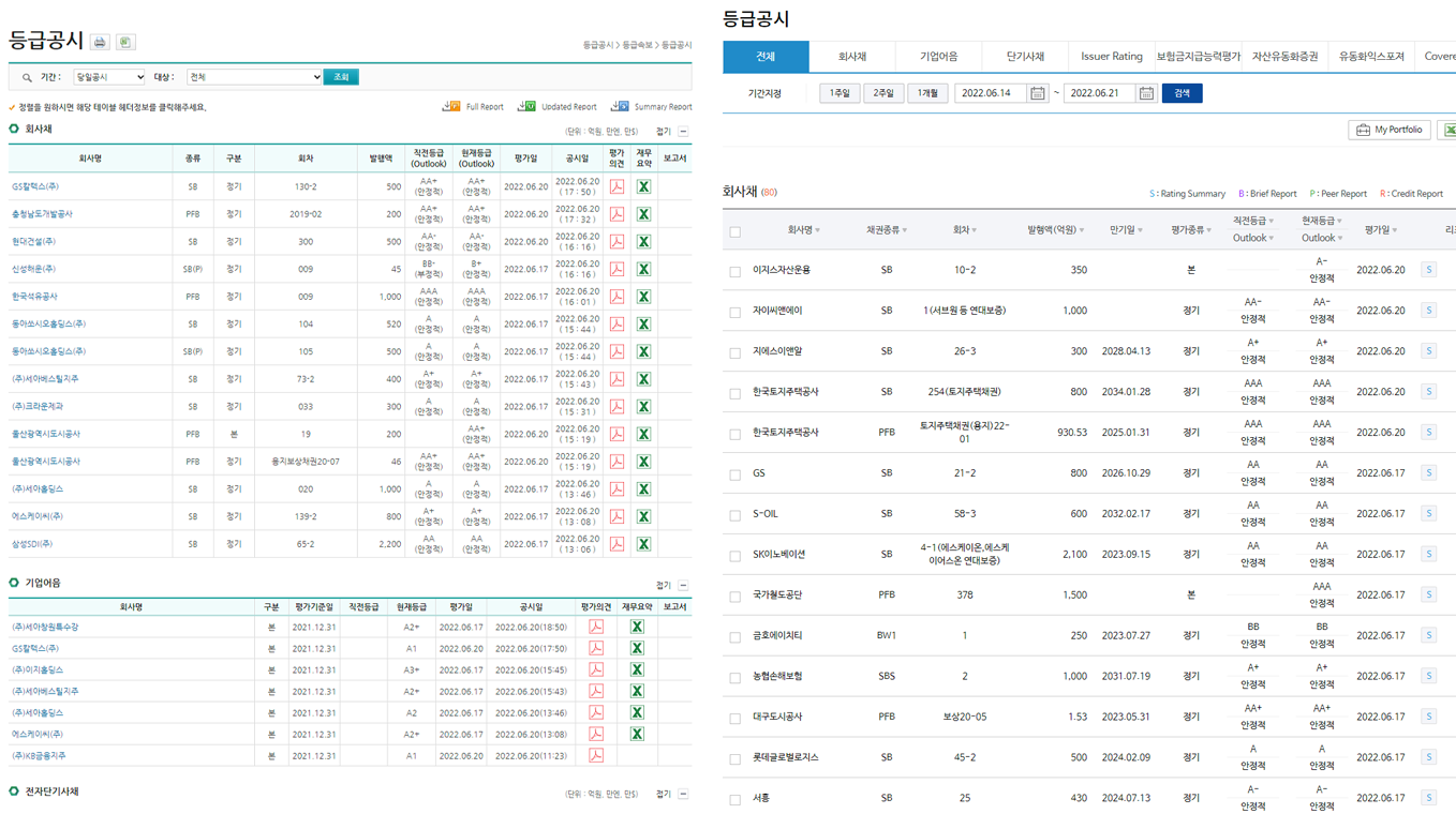 우리나라의 신용평가기관은 대표적으로 2곳이 있는데 바로 한국기업평가와 한국신용평가입니다. 위 사진대로 홈페이지에 접속하시면 다양한 채권의 신용등급을 확인하실 수 있습니다. 위 신용등급 안내 표를 참고하시면 특정 기업이 어느정도 수준으로 평가받고 있는지 알 수 있습니다.