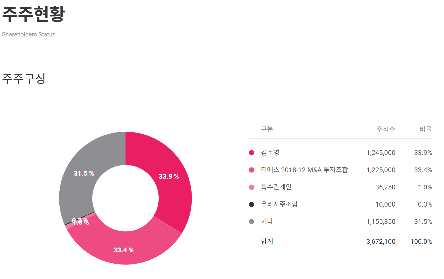김주영 대표이사님께서 33.9%의 주식을 보유하고계시고 그 다음으로 티에스 2018-12 M&A 투자조합에서 33.4%의 주식을 보유하고있네요. 투자에 참고하시면 좋겠습니다.