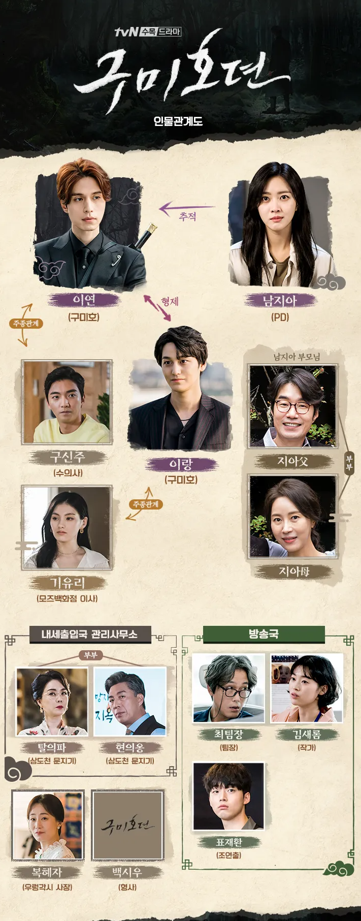기존 구미호뎐 인물관계도와 비교하면 더욱 편리합니다. 대부분 구미호뎐과 비슷하지만 달라진 부분도 눈에 띄네요. 1회 방송은 수도권 시청률 7.409%를 기록했던데 흥행에 성공했으면 좋겠습니다.