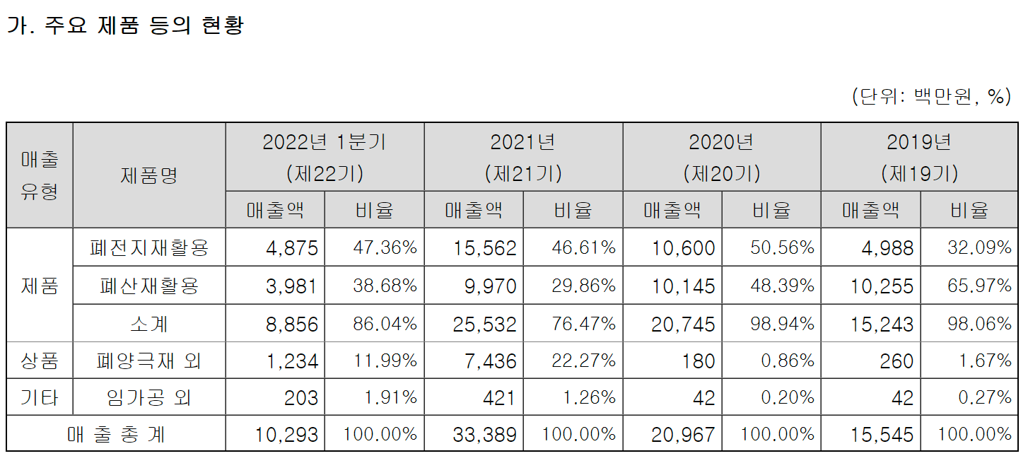 새빗켐은 폐수처리 약품 사업을 시작으로 반도체 및 디스플레이 생산 공정에서 발생하는 폐산을 재활용하여 비료 원료가 되는 인산 등을 생산하는 사업을 영위하며 성장하였습니다. 현재는 폐리튬이온 이차전지에서 양극활물질을 정제ㆍ분리하여 전기차에 적용되는 리튬이차전지의 부원료로 공급하는 사업을 영위하고 있습니다.
