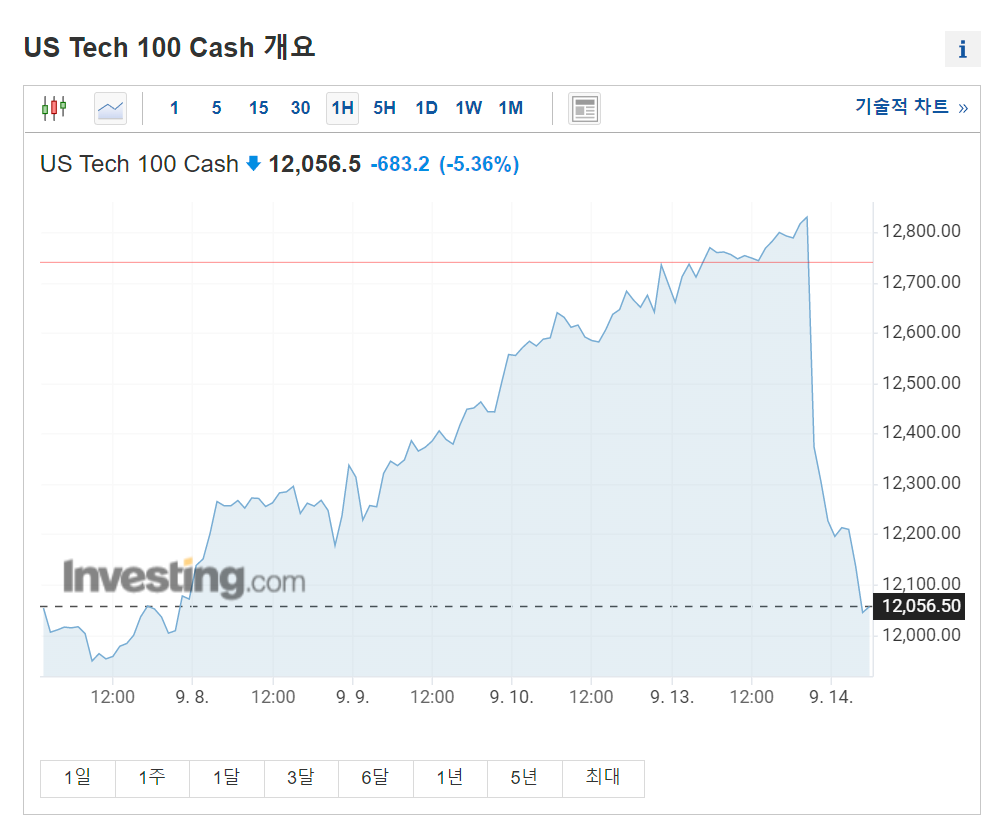위 사진은 인베스팅닷컴(investing.com)의 나스닥 100 선물 차트입니다. 이번 글에서는 미국 증시가 밤사이 급락한 이유를 알아보겠습니다.