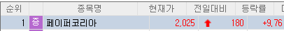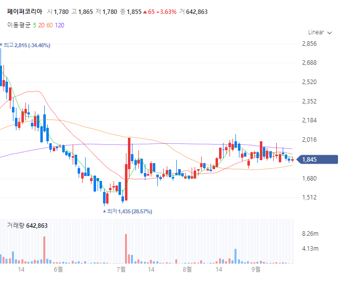 페이퍼 코리아는 9월 20일 시간외거래에서 상한가를 기록하여 종가대비 9.76% 상승한 2,025원에 거래를 마쳤습니다.