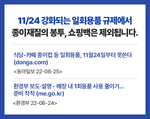페이퍼코리아 홈페이지에 접속하시면 가장 먼저 볼 수 있는 팝업창입니다. 11/24일부터 강화되는 일회용품 규제에서 종이재질의 봉투/쇼핑백은 제외된다는 뉴스 자료들 인데요, 페이퍼코리아에겐 호재로 작용할 수 있을 것 같습니다. 왜냐하면 페이퍼 코리아의 제품중에는 쇼핑백이 있기 때문입니다.