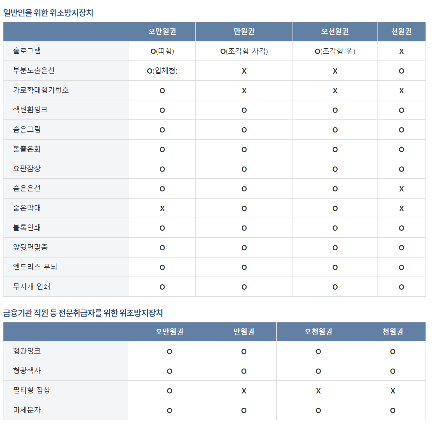 우리나라 은행권의 위조방지장치(홀로그램, 부분노출은선, 가로확대형기번호 등)사용여부를 권종에 따라 표로 안내