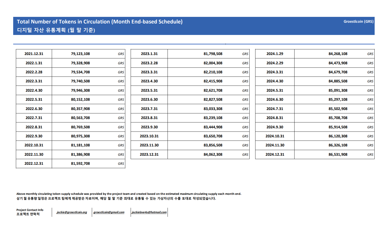 그로스톨코인의 총 발행한도는 105,000,000개 이며 아래 사진을 통해 그로스톨코인의 디지털 자산 유통계획을 확인하실 수 있습니다.