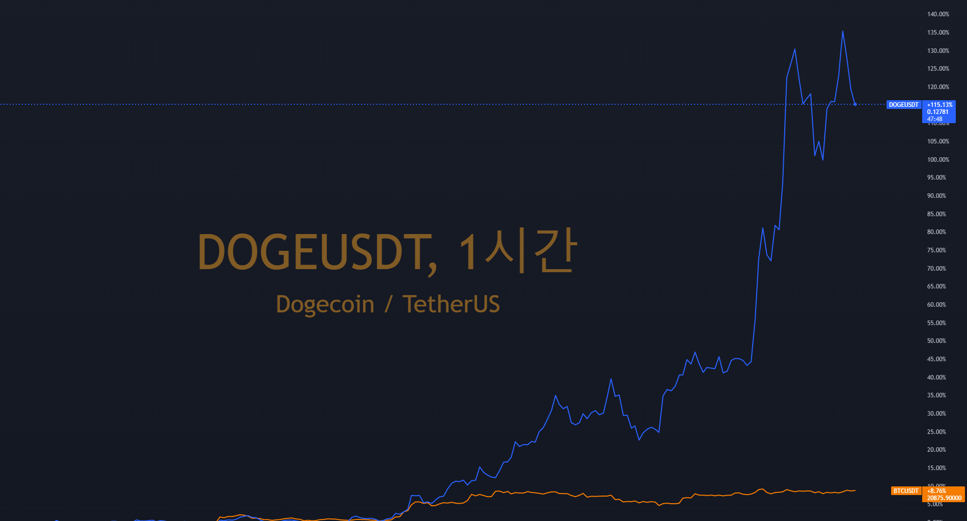 도지코인은 연일 급등세로 솔라나(SOL), 에이다(ADA)코인을 제치고 가상화폐 시장 시가총액 8위를 기록하고 있습니다. 바이낸스 거래소에서 도지코인(DOGE/USDT)은 24시간동안 42%상승한 0.13달러에 거래되고 있으며 최고가는 0.15150달러를 기록하였습니다.