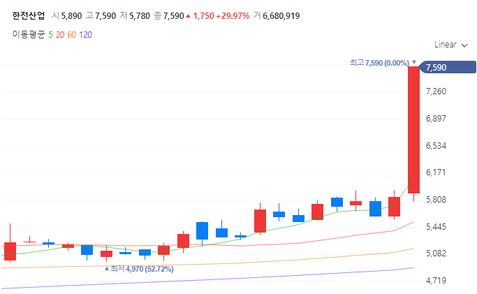 한전산업은 원자력 발전소 설비 운전 및 정비사업을 수행하며 원자력 관련주로 지목되어 급등하였습니다.
