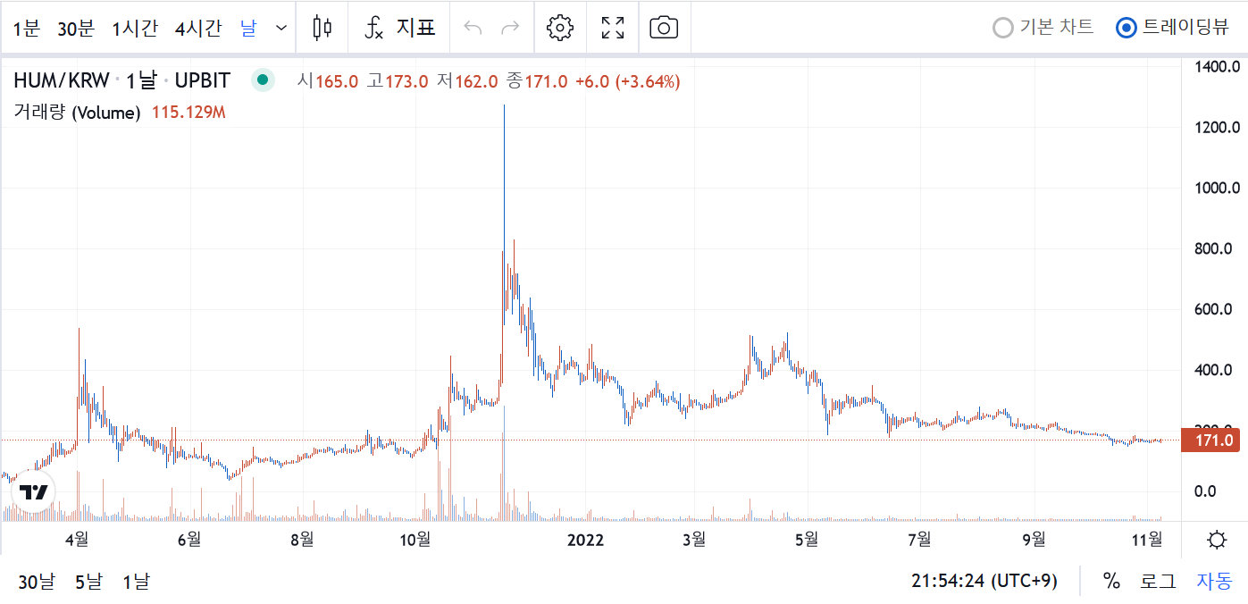 21년 말 급등 이후로 아직까지 고점을 회복하지 못하고 있습니다. 휴먼스케이프는 향후 다양한 희귀질환에 대한 연구 및 신약 개발에 기여할 것으로 예상되고 있는데, 희귀질환 신약 개발에 휴먼스케이프의 기술이 적극 활용될 수 있다면 환자 분들에게도 큰 도움이 되고 휴먼스케이프 토큰도 큰 관심을 받아 고점을 돌파하지 않을까 예상됩니다.