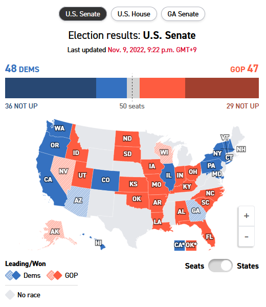 민주당은 여당임에도 불구하고 최악의 경우라도 주요 주지사/지방직을 지켜냈으며 일단 상원을 지켜냈기에 상상 이상의 선방이라는 분석들이 나오고 있습니다. 과연 결과가 어떻게 나올지 궁금하네요