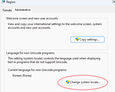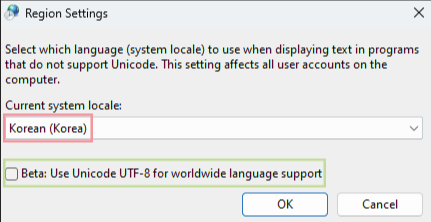 4. Current system locale을 Korean (Korea)로 변경해줍니다. 또한 아래 Beta 옵션이 체크되어있다면 해제합니다.