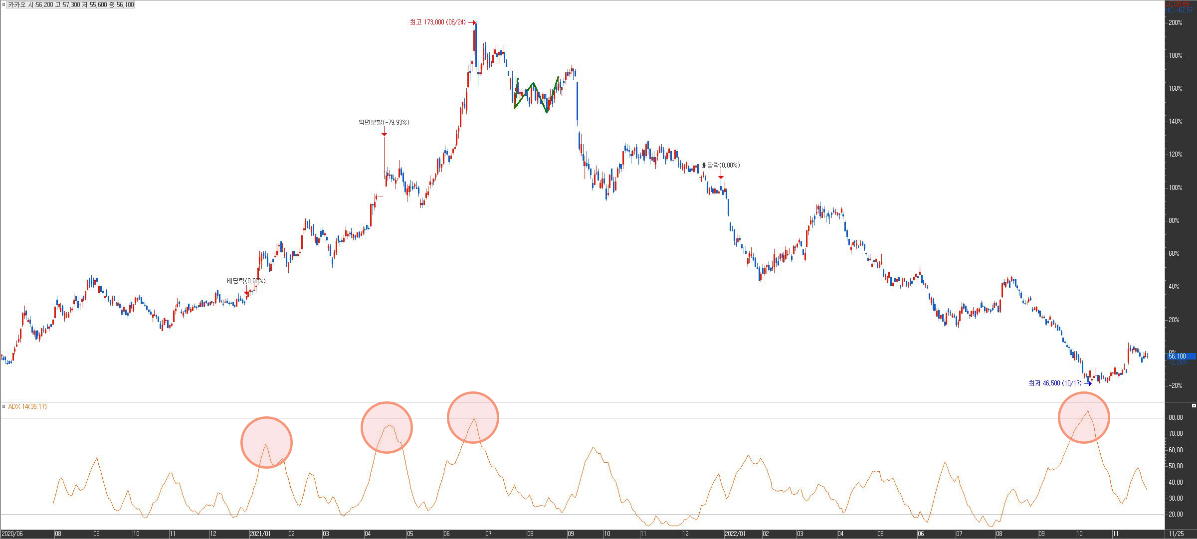 삼성전자의 경우 카카오보다 변동이 크지 않아 ADX도 움직임이 심하지 않습니다. 하지만 삼성전자에서도 ADX가 높으면 과매도를 뜻하는건 마찬가지네요. ADX는 매매에 다음과 같이 활용될 수 있겠습니다.