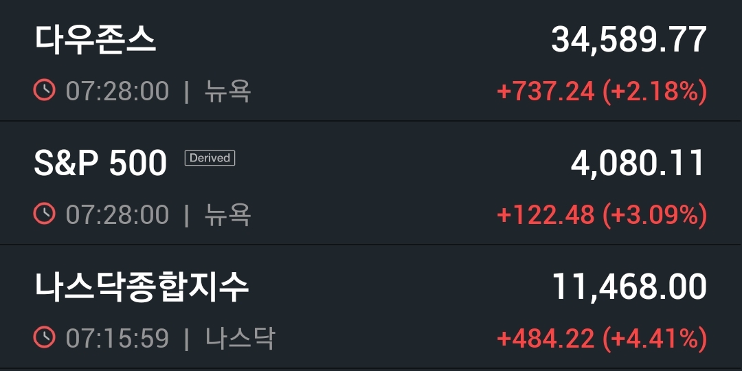 기술주 중심으로 상승하여 나스닥이 크게 상승했다는 것을 확인할 수 있습니다.