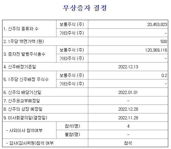 전자공시시스템에 따르면 지누스는 2022년 11월 7일 주당 0.1주 무상증자 진행을 결정했습니다.