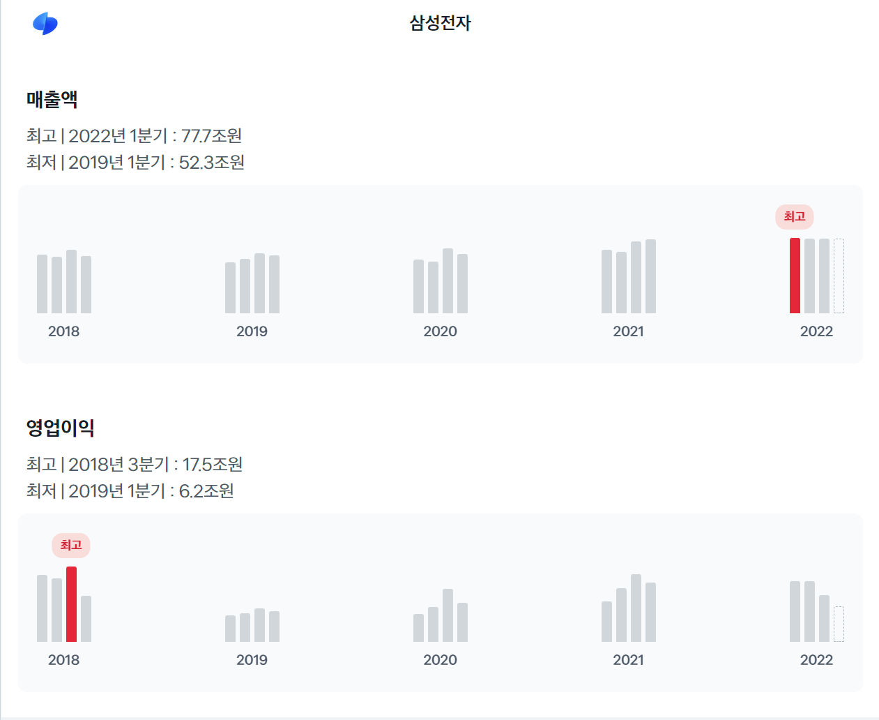 토스증권에서 제공하고 있는 삼성전자의 매출액과 영업이익입니다. 전자공시시스템을 통해 확인하는 표보다 훨씬 눈에 쏙쏙 들어오지만 자세한 정보는 알기 어렵다는 단점이 존재합니다. 즉, 자세한 정보를 통해 심화적으로 기업분석을 하고 싶다면 전자공시시스템을 사용해야 합니다.