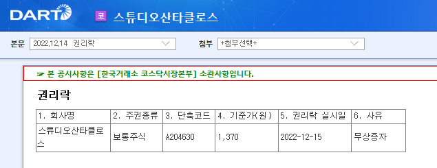 스튜디오산타클로스는 이전 무상증자를 진행하겠다 공시한 바 있었습니다. 아래 공시를 확인하시면 1주당 신주배정 주식수는 5주로 500%의 무상증자를 결정했다는 사실을 확인할 수 있습니다.