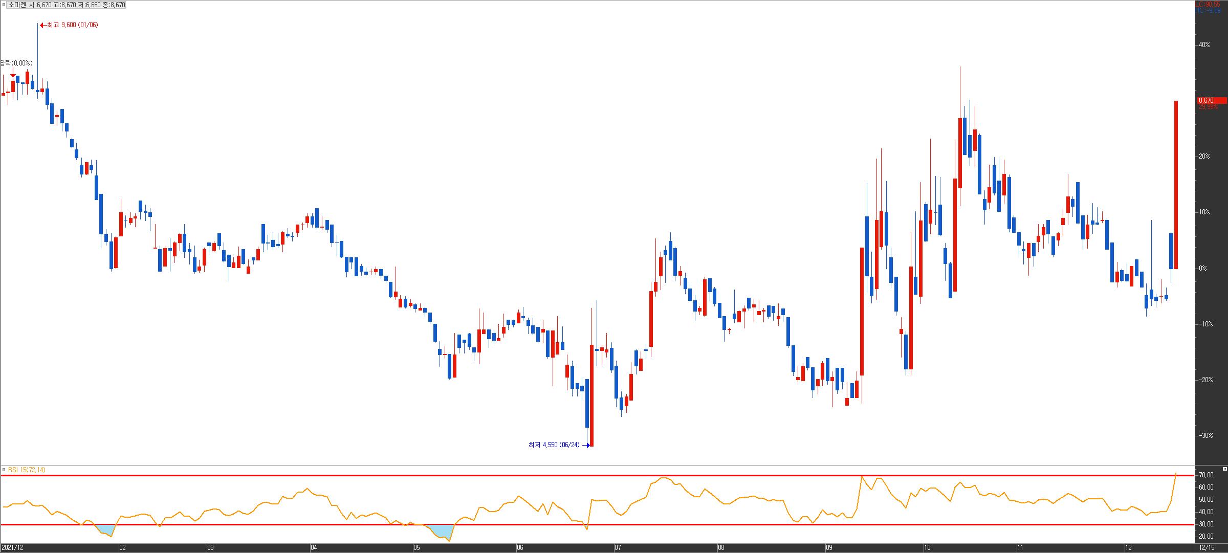 소마젠의 주가는 '상한가'에 도달하였습니다. 이에 현재 추세의 강도를 백분율로 나타내 주는 보조지표인 RSI는 72.14로 상승하며 과도 매수 상태로 접어들었습니다. 주가의 저항선은 전고점인 9,080원이 될 가능성이 매우 높습니다.