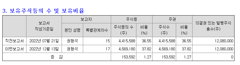 최대주주 권형석 화천기계 대표의 보유 주식 상황인데, 직전 보고서 대비 153,592주를 추가로 매수했다는 사실을 알 수 있습니다. 권형도 화천기계 부사장과 권형운 화천기공 부사장도 지분 매수를 활발히 진행하고 있으며, 김군호 대표는 코스닥 상장 이후 지분을 꾸준히 매수하고 있습니다.