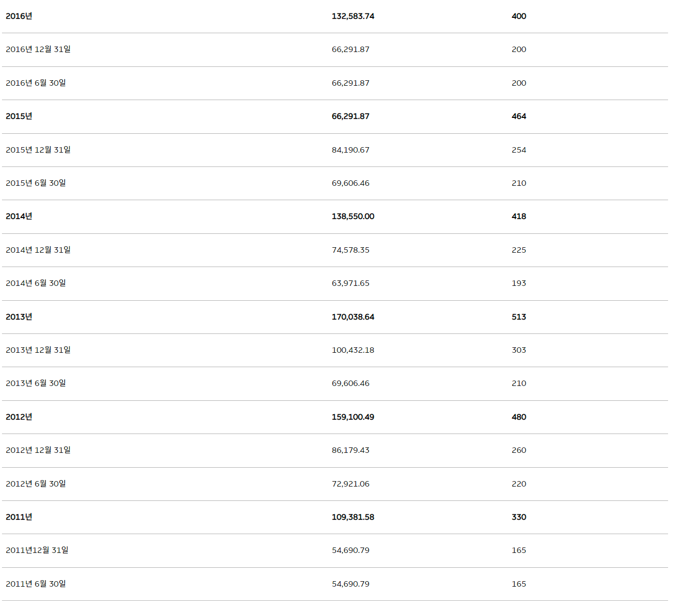 맥쿼리인프라는 안정적인 고배당주로 유명합니다. 이사회의 승인을 조건으로 주주들에게 반기(6월 말, 12월 말)마다 분배금을 지급합니다. 맥쿼리인프라의 분배금 지급 내역은 다음 사진과 같습니다. 과거의 분배금이 미래의 분배금을 보장하는건 아니라는 점 유의해주세요.