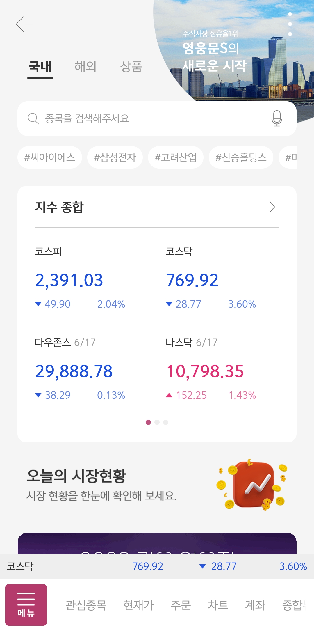 영웅문 S#의 메인 화면입니다. 기존 영웅문 4나 영웅문 G에서도 기본적인 시세는 확인할 수 있었지만 디자인이 확실히 영해진듯한 느낌이 드네요. 깔끔하게 보여 괜히 기분이 좋아지는 메인화면입니다(그나저나... 지수 무슨 일이니.....)