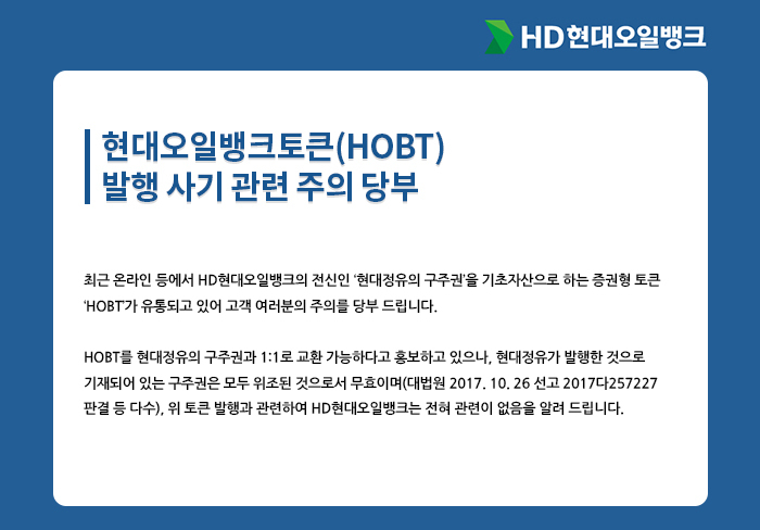 최근 온라인 등에서 HD현대오일뱅크의 전신인 '현대정유'의 구주권을 기초자산으로 하는 증권형 토큰인 HOBT가 유통되고 있습니다. HOBT를 현대정유의 구주권과 1:1로 교환 가능하여 매수만 해도 수익률이 300% 발생한다고 홍보하고 있지만 대법원 판결 결과 등에 따라 거짓이며 HD현대오일뱅크와 어떤 연관성도 없는 사기입니다. 현재 온라인상에서 홍보하고 있는 내용은 다음과 같으니 주의하시기 바랍니다.