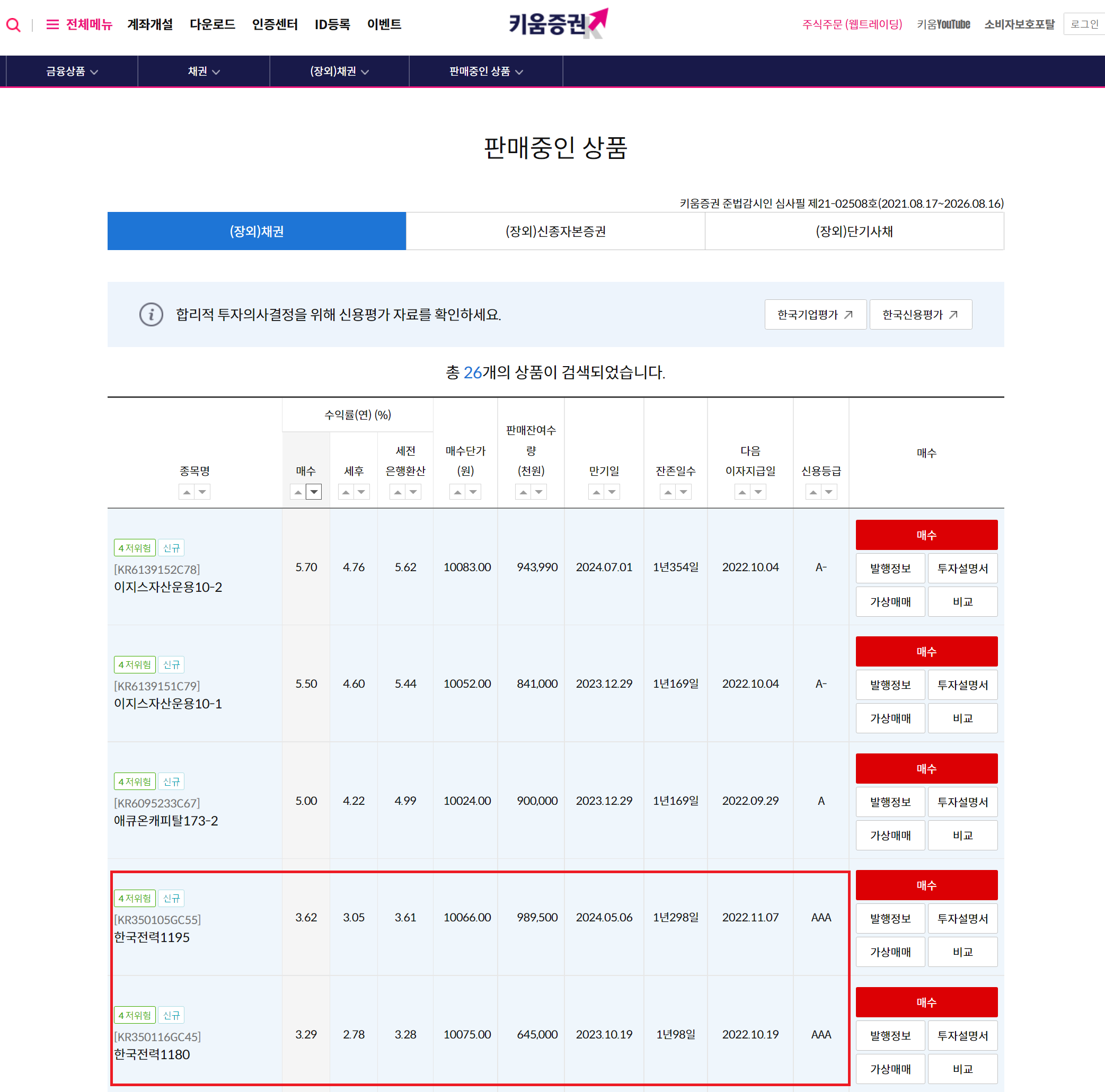 키움증권 홈페이지에서 금융상품>채권>장외채권>판매중인 상품으로 들어가 보시면 키움증권에서 판매 중인 장외채권들의 리스트가 보입니다. 한국전력 1195와 한국전력 1180 채권이 존재하는데 무슨 차이며 어떤 채권을 사야 유리할까요?