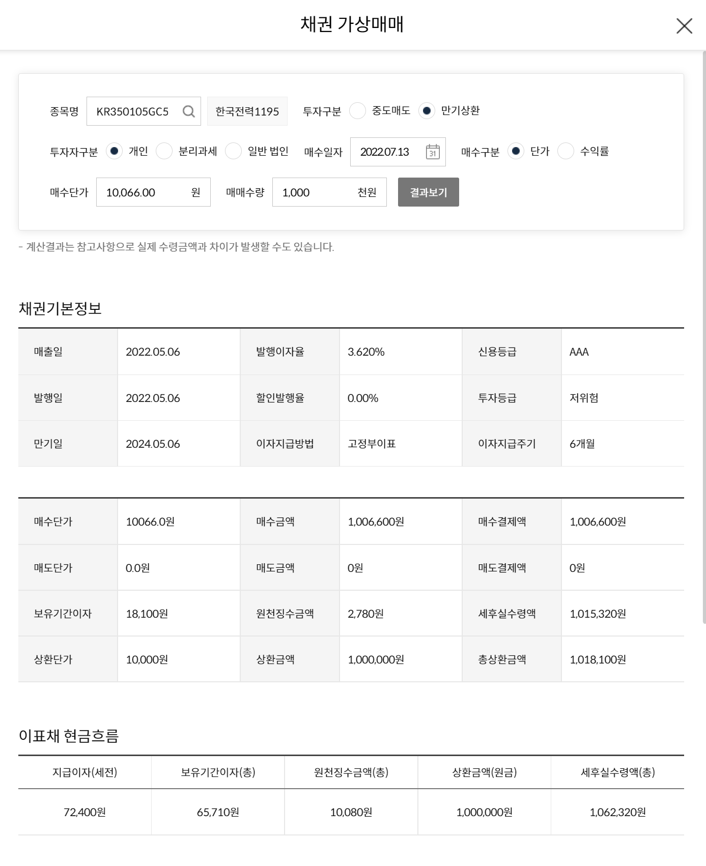 한국전력 1195 채권을 만기상환으로 7월 13일 10,066원에 1,000천원 매수를 가정하여 채권 가상매매 시스템을 돌려보았는데, 매수결제액부터 지급이자, 원천징수금액, 세후실수령액까지 한번에 알 수 있어 정말 편리합니다.