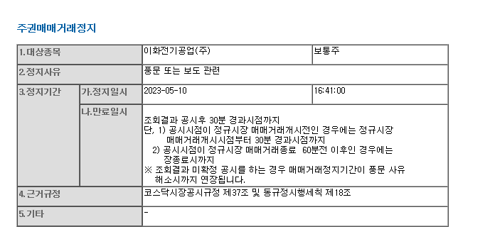 23년 5월 10일 이화전기, 이아이디, 이트론이 횡령배임혐의설을 이유로 매매정지 되었습니다. 이런 이유로 이화그룹 상장 3사는 시간외 시장에서 급락한 가격에 거래되고 있습니다. 이화그룹의 조세포탈 혐의를 수사 중인 검찰은 이날 전 이화전기 회장과 이화전기 대표에 대해 구속영장을 청구한 것으로 알려졌는데, 한국거래소에서 이와 관련된 조회공시를 요구한 것으로 추정됩니다.