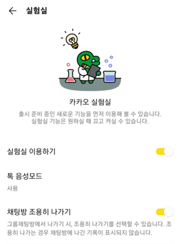 설정 -> 카카오톡 실험실에서 '채팅방 조용히 나가기' 기능을 활성화 할 수 있습니다. PC 카카오톡에서도 사용할 수 있으며 최신버전(v10.2.0 이상)으로 업데이트가 필요합니다.