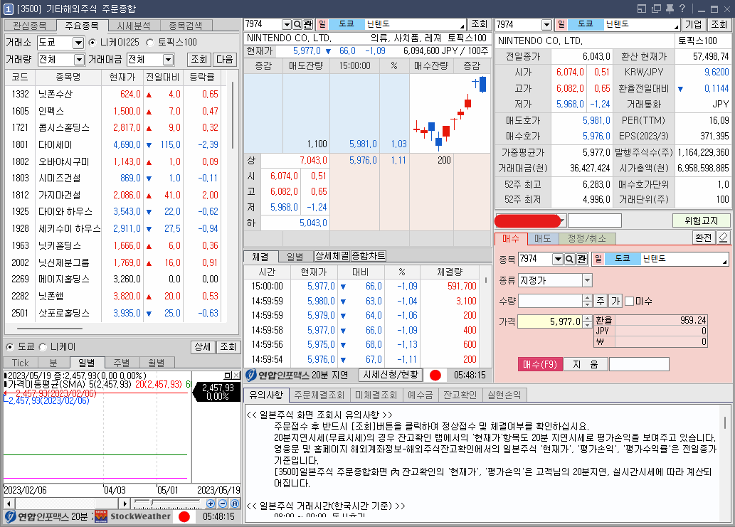 실시간 시세를 별도로 신청하지 않을 경우 20분 지연시세로 표시되니 유의해야합니다. 일본주식의 거래시간은 한국시간 기준으로 다음과 같습니다. 점심 휴장시간 내 신규주문은 불가하며 정정/취소 주문은 12:05부터 가능합니다.