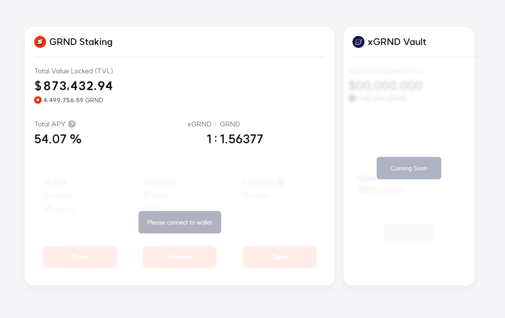 유저는 GRND를 스테이킹하여 xGRND를 얻을 수 있습니다. xGRND는 스테이킹 시점의 GRND:xGRND 가치 비율에 따라 교환되며 언스테이킹 할 때에도 마찬가지로 적용됩니다.