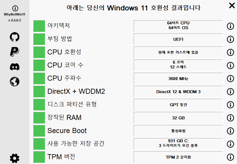 WhyNotWin11은 본인의 PC가 윈도우 11의 최소 설치 사양을 충족하는지 체크해주는 프로그램인데, 쉽게 말해 이 PC에 윈도우 11 설치가 가능한지 불가능 하다면 그 이유는 뭔지 알려주는 프로그램입니다. 위 사진은 제 PC를 "WhyNotWin11"프로그램을 이용해 검사한 사진인데 좌측에 모두 초록색으로 표시되어 있는 것을 보실 수 있습니다. 이 경우엔 윈도우 11을 PC에 정상적으로 설치할 수 있다는 것을 의미합니다.