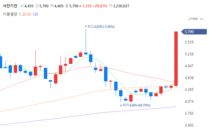 서전기전은 장초 강세를 보이다 오후 12시에 갑작스럽게 급등하였습니다. 개인 투자자들은 원전 관련주에 편입이 된 거 아니냐는 의문을 품고 있으며 아직까지 급등을 설명할 공시는 없습니다.