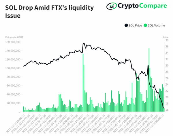 많은 전문가들은 솔라나 토큰의 하락은 이번 FTX 거래소 뱅크런 사태와 연관되어 있다고 말합니다. 암호화폐 분석가 더티버블미디어는 알라메다의 성장 과정이 셀시우스 거래소와 매우 비슷한 방식이라고 지적하였으며 결국 FTX거래소가 유동성 위기에 빠져있음이 밝혀졌습니다. FTX가 주로 거래를 지원하던 솔라나 토큰은 알라메다가 유동성 확보를 위해 대량으로 매각할 가능성이 있어 폭락하고 있습니다.