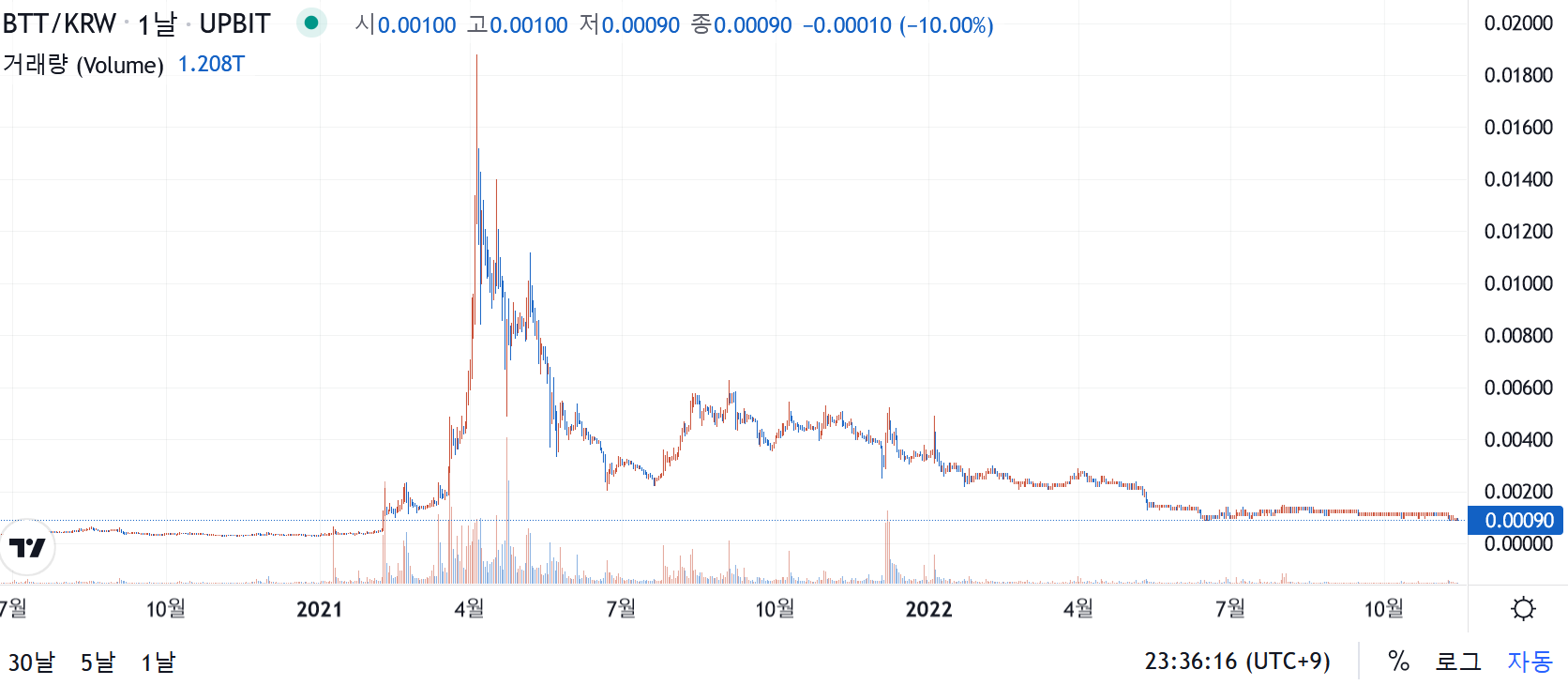 시세가 큰 폭으로 하락한 후 쉽게 반등하지 못하고 있는 상황입니다. 코인 채굴 전문가의 말에 따르면 BTT 토큰은 불법적인 파일 공유 없이 유의미한 양을 얻긴 어렵다는데요. 위 말이 사실일 경우 채굴 방법의 개편이나 사업의 개편 없이는 전망이 좋지 않아 보입니다. 다른 코인들에 비해 우위에 있는 부분도 분명 존재하나 단기간의 급등을 바라기는 어려운 상황이라고 분석됩니다.