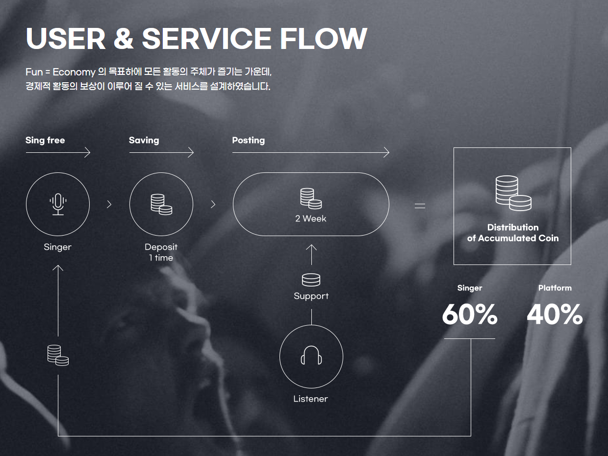 무료로 재밌게 노래를 부르고 섬씽 토큰(SSX)까지 인센티브로 받는 것을 보면 위 사진 속 Fun = Economy라는 목표에 맞게 서비스가 설계되었다고 생각됩니다.