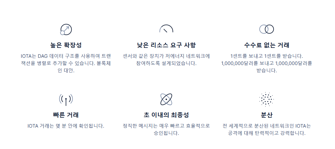 DAG의 일종인 탱글 알고리즘을 사용하여 거래수수료 없이 빠른 트랜잭션과 확장성을 확보했다는 것이 아이오타의 가장 큰 장점입니다. 이런 특성 상 작은 거래가 많이 일어나는 상황에 적절하여 사물인터넷이나 소액결제에 최적화 되어있습니다. 아이오타는 사물인터넷을 위한 암호화폐 플랫폼인데 스마트폰, 가전제품, 헬스케어, 자동차 등등 다양한 스마트 기기를 인터넷과 연결하여 관리하는 것에 도움을 줍니다. 또한 믹서, 맘 등 다양한 보안 기술을 적용하여 거래 참여자들의 개인정보를 보호하며 허가된 사용자만 암호화된 데이터를 볼 수 있도록 하고있습니다.