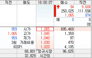 이미 11월 14일 부터 상승이 있었는데요. 120일선 돌파를 계속 시도하다가 실패하고 금일 도지형 캔들이 발생되어 있는 모습입니다. 시간외단일가 시장에서 상한가를 기록한 것으로 보아 정규장에 크게 상승할 것으로 전망되는데요. 과연 전고점(1,115원)을 뚫고 상승할 수 있을지 기대됩니다.