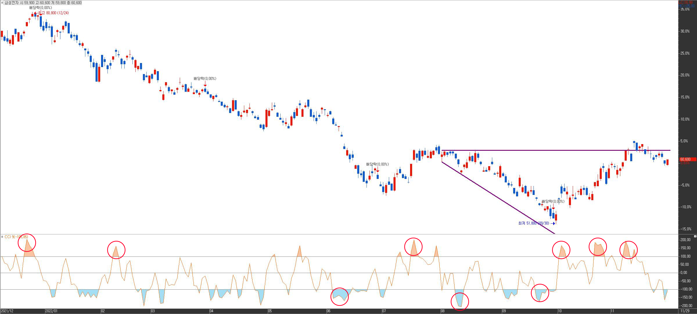 카카오 차트에 CCI를 추가한 모습입니다. CCI가 상향기준선을 초과한 부분은 주가가 평균보다 높다는 부분을 알 수 있습니다. 최근 카카오가 저가를 갱신했을 때에는 CCI가 -90.83으로 하향기준선을 돌파하진 않았네요 삼성전자의 차트도 확인해보겠습니다.
