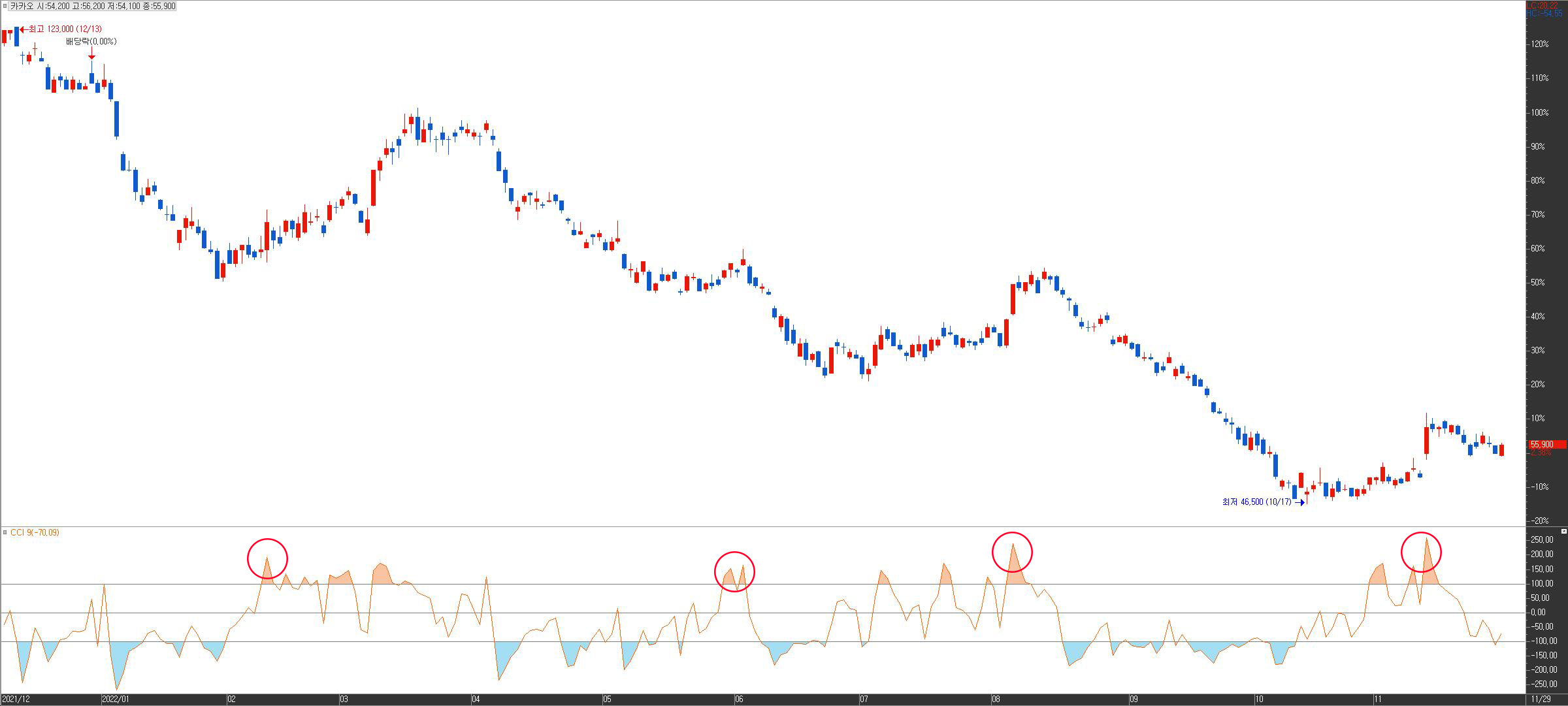 이번엔 아래 CCI가 하향 기준선을 하향돌파 한 상황에도 빨간색으로 표시해봤습니다. 미래 가치가 지금보다 높은 기업이라고 생각하는 경우 평균 주가보다 저렴하게 매입하면 더 큰 수익을 올릴 수 있겠습니다. CCI는 매매에 다음과 같이 활용될 수 있겠습니다.