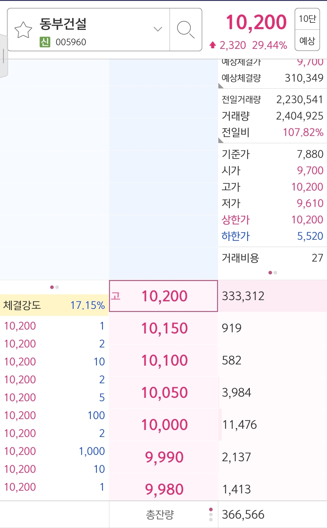 동부건설은 상한가에 도달하여 10,200원을 기록하였으며 동부건설우는 2일 연속 상한가에 도달해 38,600원을 기록하고 있습니다.