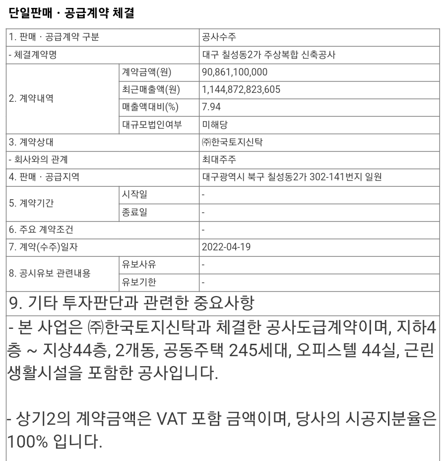 11월 25일 공시된 내용입니다. 공시에 따르면 대구광역시 북구 칠성동 2가 302-141번지 일원에 지하4층 ~ 지상44층, 2개동, 공동주택 245세대, 오피스텔 44실, 근린생활시설 공사를 진행한다고 하는데요. 규모는 900억 원으로 최근 매출액 대비 7.94%에 해당하는 규모입니다.