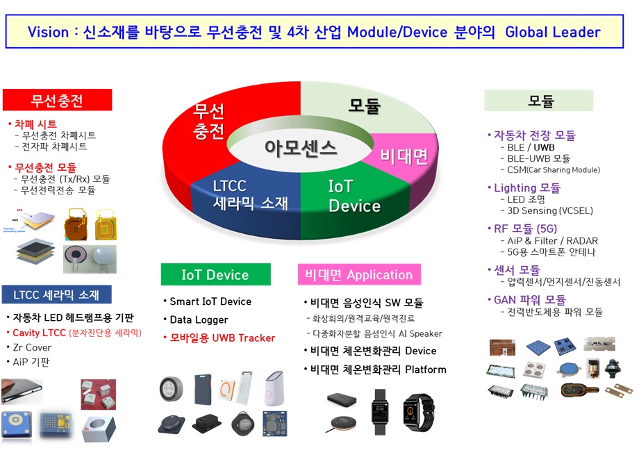 아모센스는 차세대 전장 및 사물인터넷 토털 솔루션 전문기업이다. 글로벌 최초로 무선충전 차폐 시트를 개발한 기업이다.