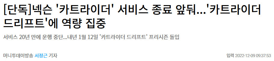 2022년 12월 9일 머니투데이의 단독 보도를 통해 넥슨이 개발사에 2023년 상반기 중 카트라이더의 서비스는 종료하고, 개발 팀은 카트라이더:드리프트로 이동한다고 통보했다는 내용이 전해졌습니다. 크레이지레이싱 카트라이더의 후속작 카트라이더 드리프트가 2023년 1월 출시됨에 따라 신작에 역량을 집중하기 위함으로 보입니다.